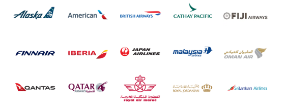- Includes oneworld airlines and some partner airlines like AA/AS/AT/AY/BA/CX/EI/FJ/GK/IB/JL/ JQ/MH/NU/PG/QF/QR/RJ/UL/WS/3K